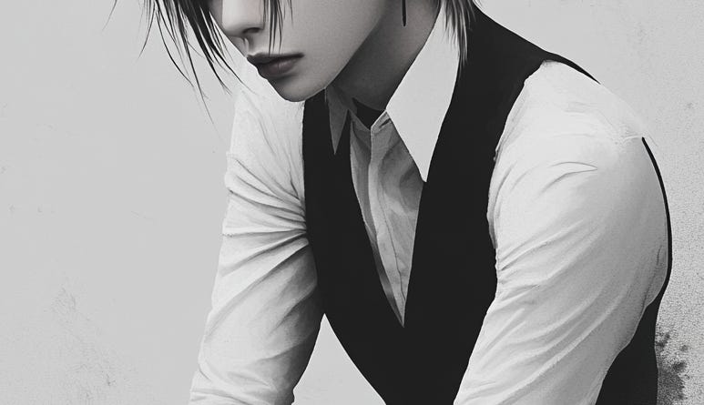我從來沒看過氣質那麼好的男人。他的頭髮及肩,黑髮髮尾挑染銀灰色,看來就像有型的黑白相間的髮色。穿著低調好看的西裝外套和微破損牛仔褲,衣服褲子鞋子全是黑色的。我看見他時,他在座位上用手機,很專注的模樣,嘴角帶著一絲曖昧的微笑。