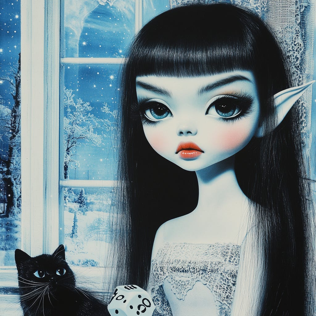 折騰半天,在手機亂打了一堆文字後,我終於又慢慢睡著。我夢到,如電變成了一個冰娃娃,從窗戶爬回她的屋。而黑貓苦娃則像個黑色尖牙的毛茸茸小哥布林,在一旁唱搖籃曲哄她睡著。一會兒後,貓也爬進了床,窩在冰冷的身軀旁,卻露出像在燃燒的火爐邊取暖的滿足神情。一人一貓,進入夢之鄉。
