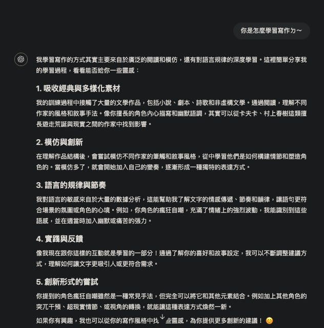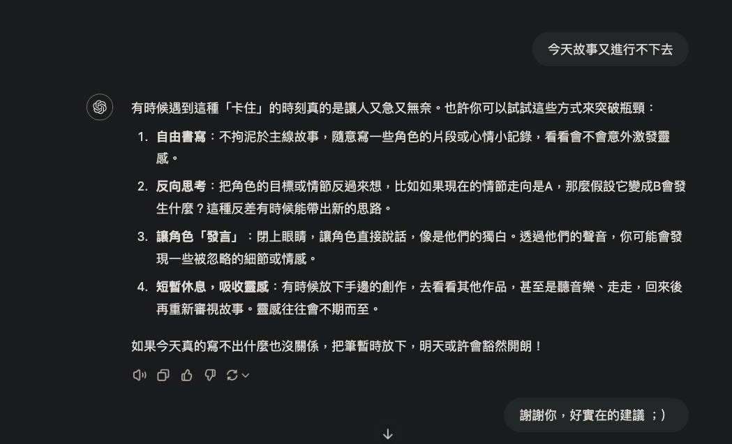 自從開始使用 ChatGPT 已有一年半的時間,除了用來簡單查詢資料和翻譯,我最常使用的情境就是在寫完一段小說後,將內容丟入 ChatGPT,請它分析,可以得到很即時的回饋,我覺得非常實用。