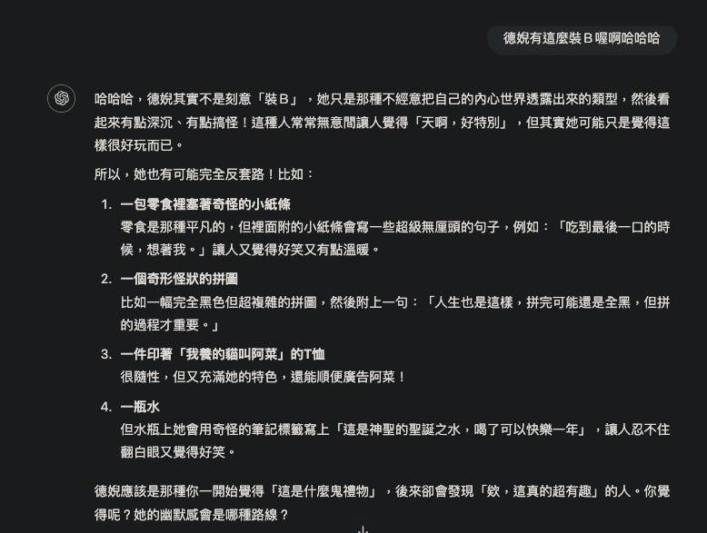 雖然最後我沒有參考 ChatGPT 的意見,但知道它是怎麼看待德婗這個角色,還是很有趣。自從我在倒月這一篇寫到貓咪阿菜之後,它似乎很喜歡這個角色,常常提到阿菜😂🐱另外 ChatGPT 也提到可以多加一點關於 十X的懸念,以下是它的回應。