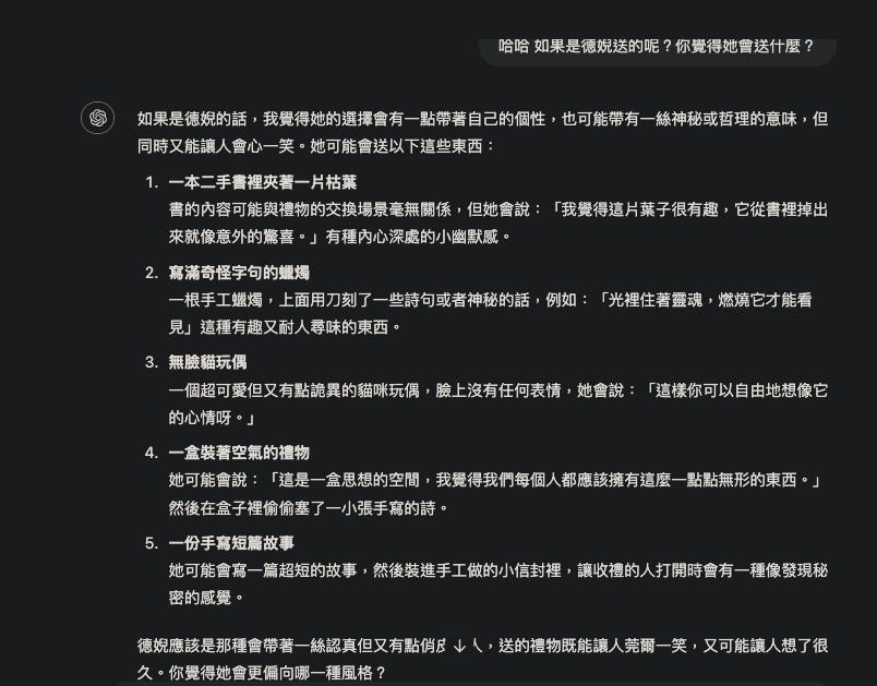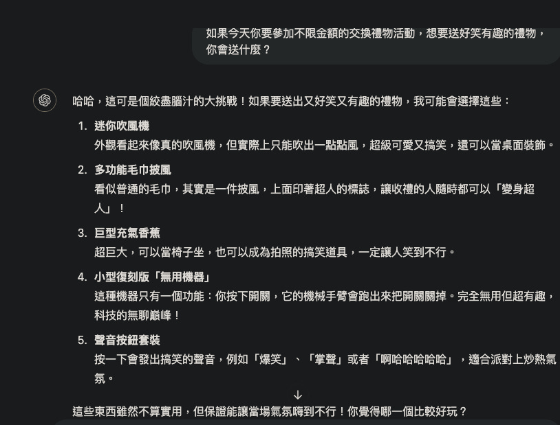 在 NewSpeak!! 聖誕夜驚魂這一篇,寫到交換禮物的情節。我寫到一半時,詢問了ChatGPT 若是它會交換什麼禮物。