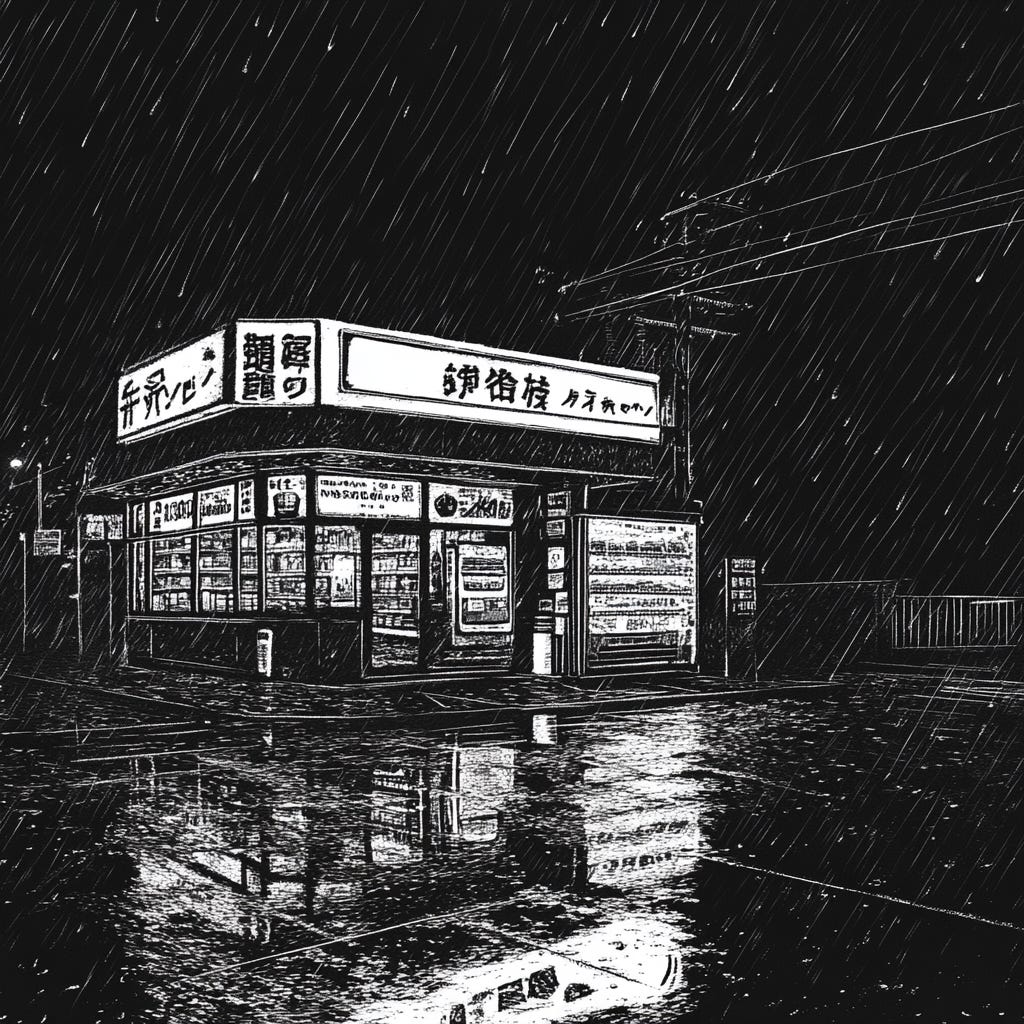 島南的夜挺熱鬧,其實,和島北也沒什麼不同。鹽酥雞、滷味、燒烤攤,夾娃娃店霓虹吸睛,穿著拖鞋的情侶兩三對。看起來沒什麼怪異之處,我似乎鬆了口氣,還是快忘記那個夢吧,還有什麼影時間的,也都忘了吧。撐著傘晃了一圈,果然不知做什麼,還是慢慢往便利商店前進。雖然沒有很餓,但有一點點嘴饞,不要再疑神疑鬼的,快點進去就是。我拿了一包零食和一瓶飲料去結帳,正要走出便利商店時,看見座位區有個男人在吃牛肉麵泡麵,味道很香,接著我突然發現——那是黃正。