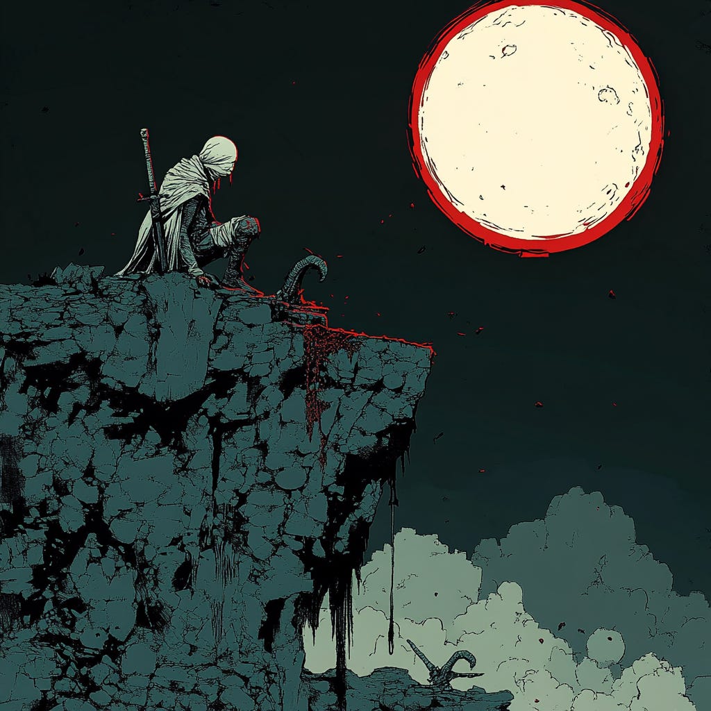 我上網搜尋了《SEVEN BOWLS》在兩個月前發布的遊戲 Trailer,那迷幻憂鬱的風格真的很吸引人。Trailer 中並沒有出現類似黑棄士的人物的身影,只有全身纏著繃帶的屍者和數個巨型怪物戰鬥,看起來就超難對付。Trailer 中沒有出現重要的角色很常見,總是要賣賣關子,但會不會黑棄士根本不存在?一切都是那個什麼白幽靈騙了屍者呢?