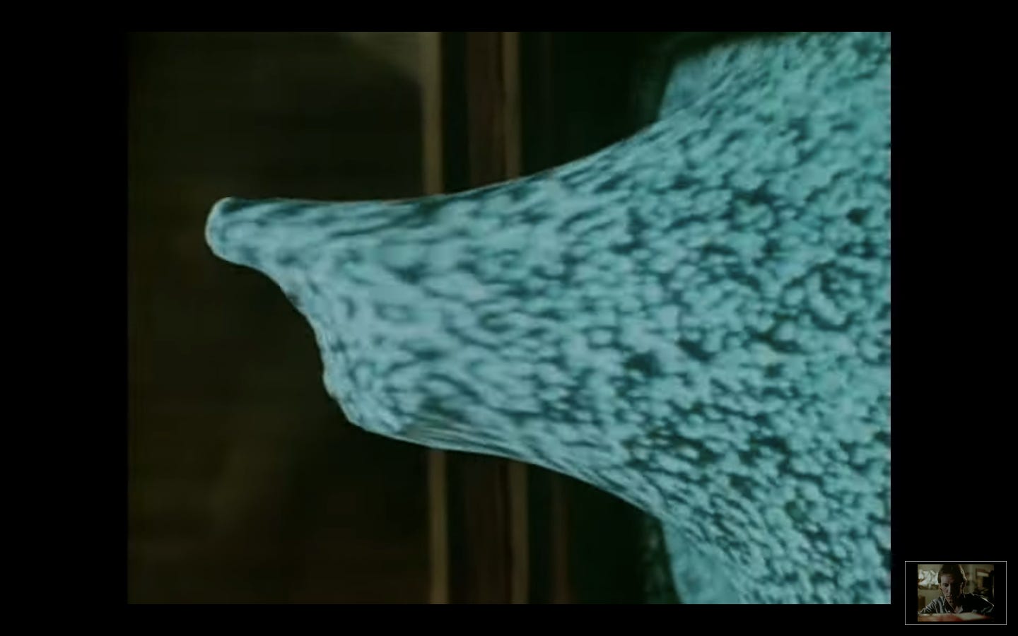 那一晚,我們三人都在,社團播放了大衛柯能堡的《Videodrome》。電影情節我已經有點忘記了,大概是一部媒體、機械與肉體合體的奇情幻想曲。有一幕,從宛如肉體的電視中伸出了一隻手,開了槍。